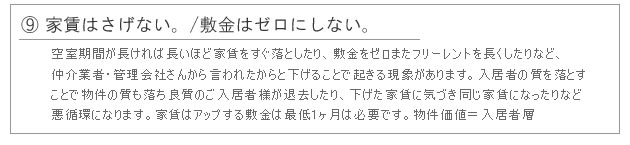 | オーナー様の心得10ヶ条は、空室が即満室になることだけを掲載させていただいております。あくまでヒントを出すだけで答えはあなたが見つけ出してください。商品ブランドのリノリースでは答えは出しておりますが、家主様あなた本人が現代の賃貸市場の実態を知り、変わろうとする気持ちがなければ結果も変わりません。満室にするまでのプロセスに100%の答えがないのです。アドバイスとして受け止めていただければと思います。まずはあなたの意識が何を目指しているのかで受け止め方はそれぞれあると思いますが、実行あるのみです。 |